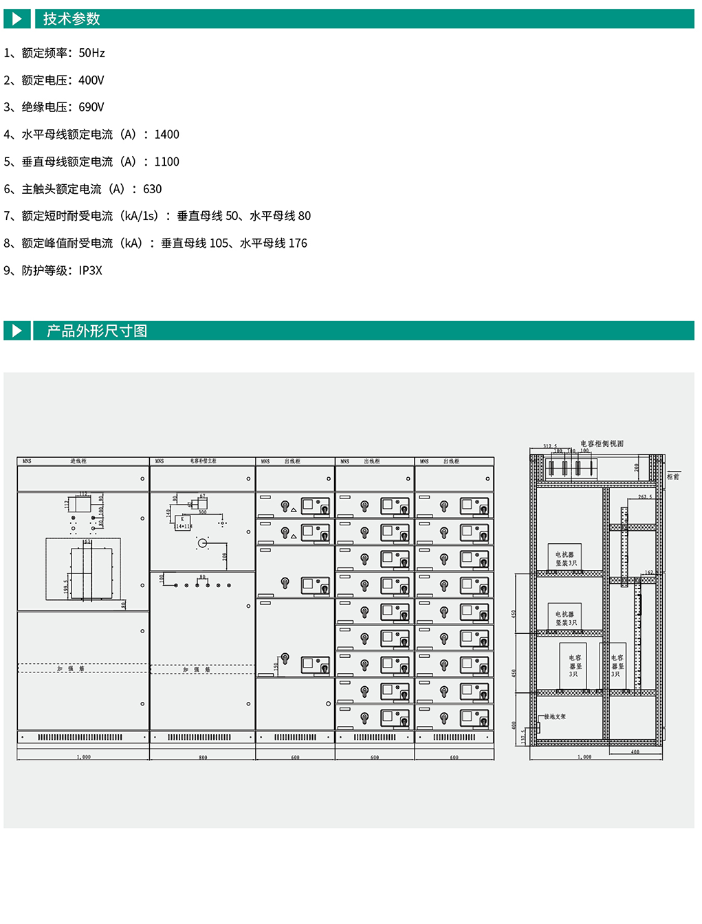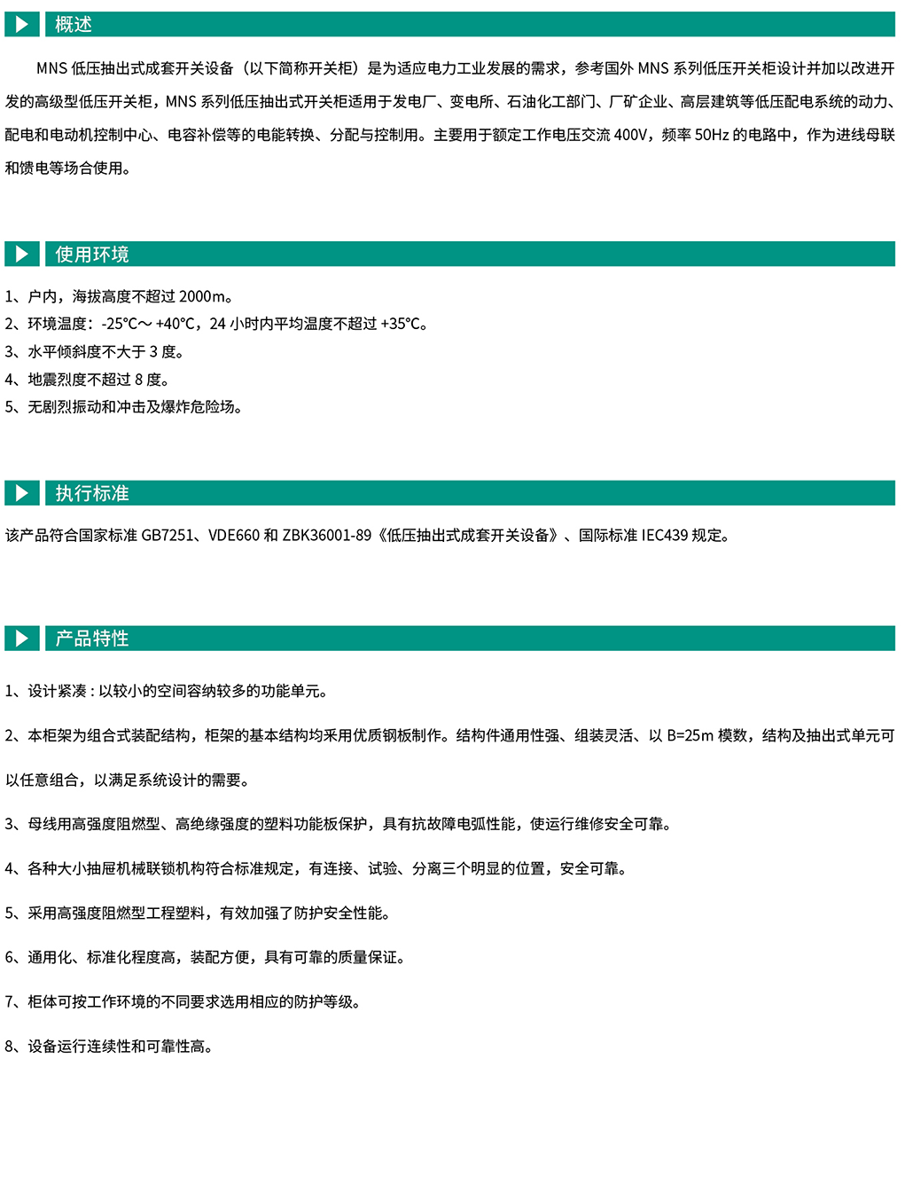 MNS型低压抽出式成套开关设备(以下简称开关柜)是为适应电力工业发展的需求,参考国外MNS系列低压开关柜设计并加以改进开发的高级型低压开关柜,MNS系列低压抽出式开关柜适用于发电厂、变电所、石油化工部门、厂矿企业、高层建筑等低压配电系统的动力、配电和电动机控制中心、电容补偿等的电能转换、分配与控制用。主要用于额定工作电压交流400V,频率50Hz的电路中,作为进线母联和馈电等场合使用。