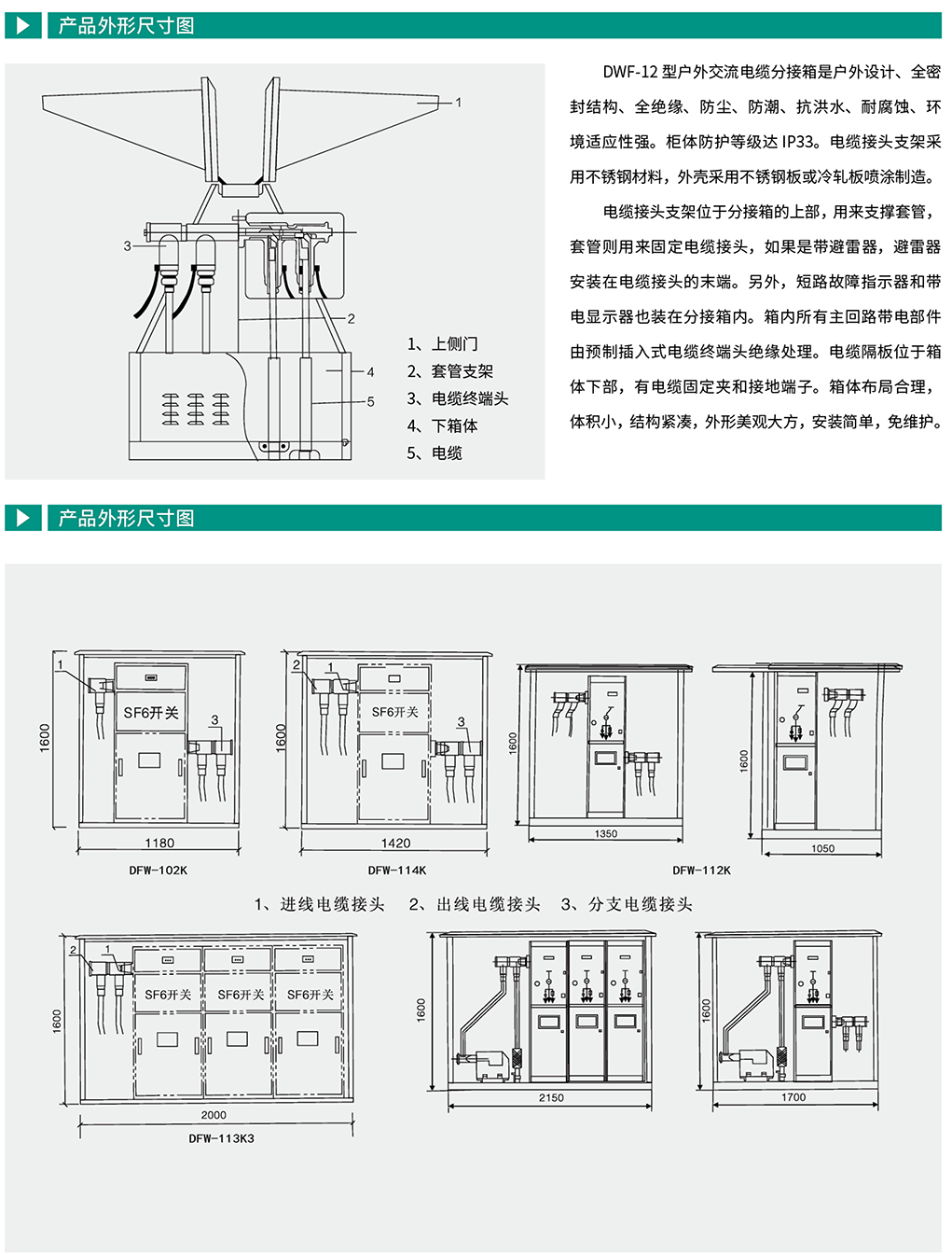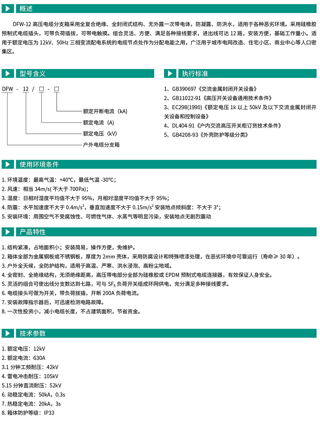 FW-12/630高压电缆分支箱采用全复合绝缘、全封闭式结构、无外露一次带电体,防凝露、防洪水,适用于各种恶劣环境。采用硅橡胶预制式电缆插头,可带负荷插拔,可带电触摸。组合灵活、方便、满足各种接线要求,进出线可达12路,安装方便,基础工作量小。适用于额定电压为12kV、50Hz三相变流配电系统的电缆节点处作为分配电能之用,广泛用于城市电网改造、住宅小区、商业中心等人口密集区。
