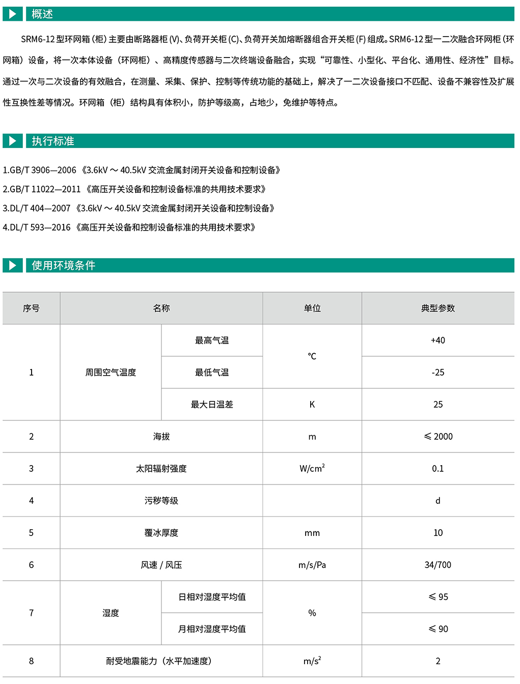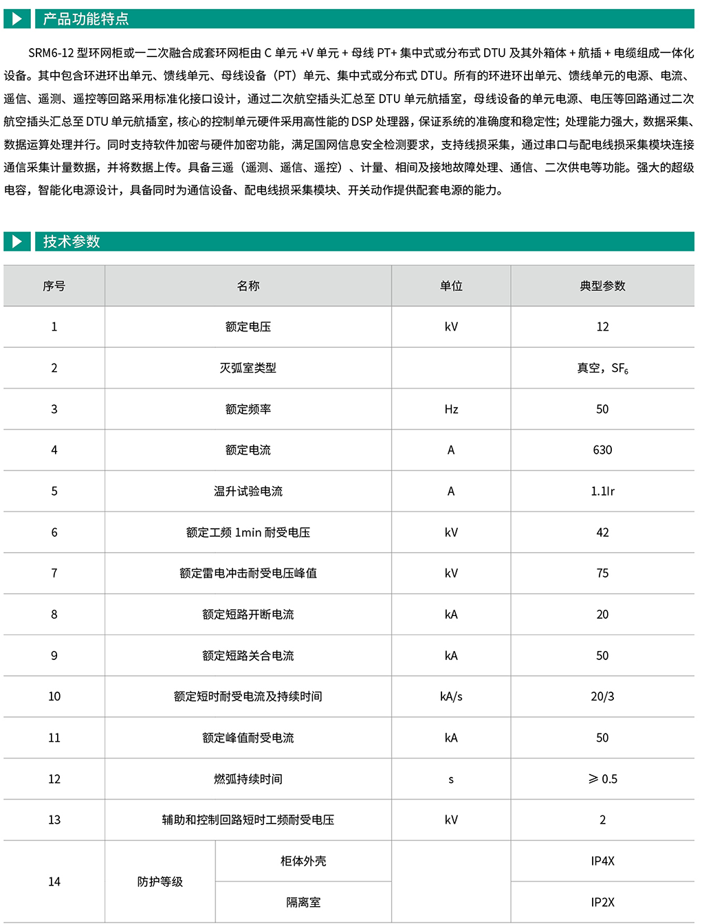 SRM6-12型环网箱(柜)主要由断路器柜(V)、负荷开关柜(C)、负荷开关加熔断器组合开关柜(F)组成。SRM6-12型一二次融合环网柜(环网箱)设备,将一次本体设备(环网柜)、高精度传感器与二次终端设备融合,实现“可靠性、小型化、平台化、通用性、经济性”目标。通过一次与二次设备的有效融合,在测量、采集、保护、控制等传统功能的基础上,解决了一二次设备接口不匹配、设备不兼容性及扩展性互换性差等情况。环网箱(柜)结构具有体积小,防护等级高,占地少,免维护等特点。