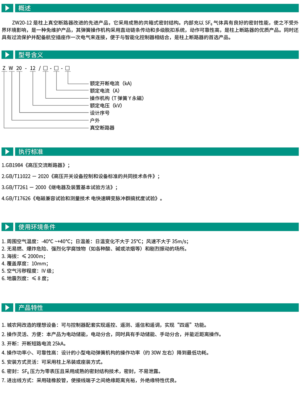 ZW20-12是柱上真空断路器改进的先进产品,它采用成熟的共箱式密封结构。内部充以SF6气体具有良好的密封性能,使之不受外界环境影响,是一种免维护产品,其弹簧操作机构采用直动链条传动和多级脱扣系统,动作可靠性高,是柱上断路器的优质产品。同时还具有过流保护并配备航空插座作一次电气来连接,便于与智能化控制器相结合,是柱上断路器的首选产品。