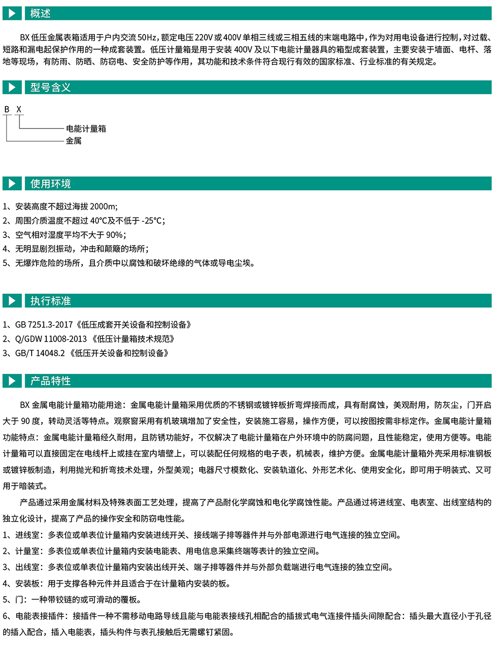 BX型低压金属表箱适用于户内交流50Hz,额定电压220V或400V单相三线或三相五线的末端电路中,作为对用电设备进行控制,对过载、短路和漏电起保护作用的一种成套装置。低压计量箱是用于安装400V及以下电能计量器具的箱型成套装置,主要安装于墙面、电杆、落地等现场,有防雨、防晒、防窃电、安全防护等作用,其功能和技术条件符合现行有效的国家标准、行业标准的有关规定。