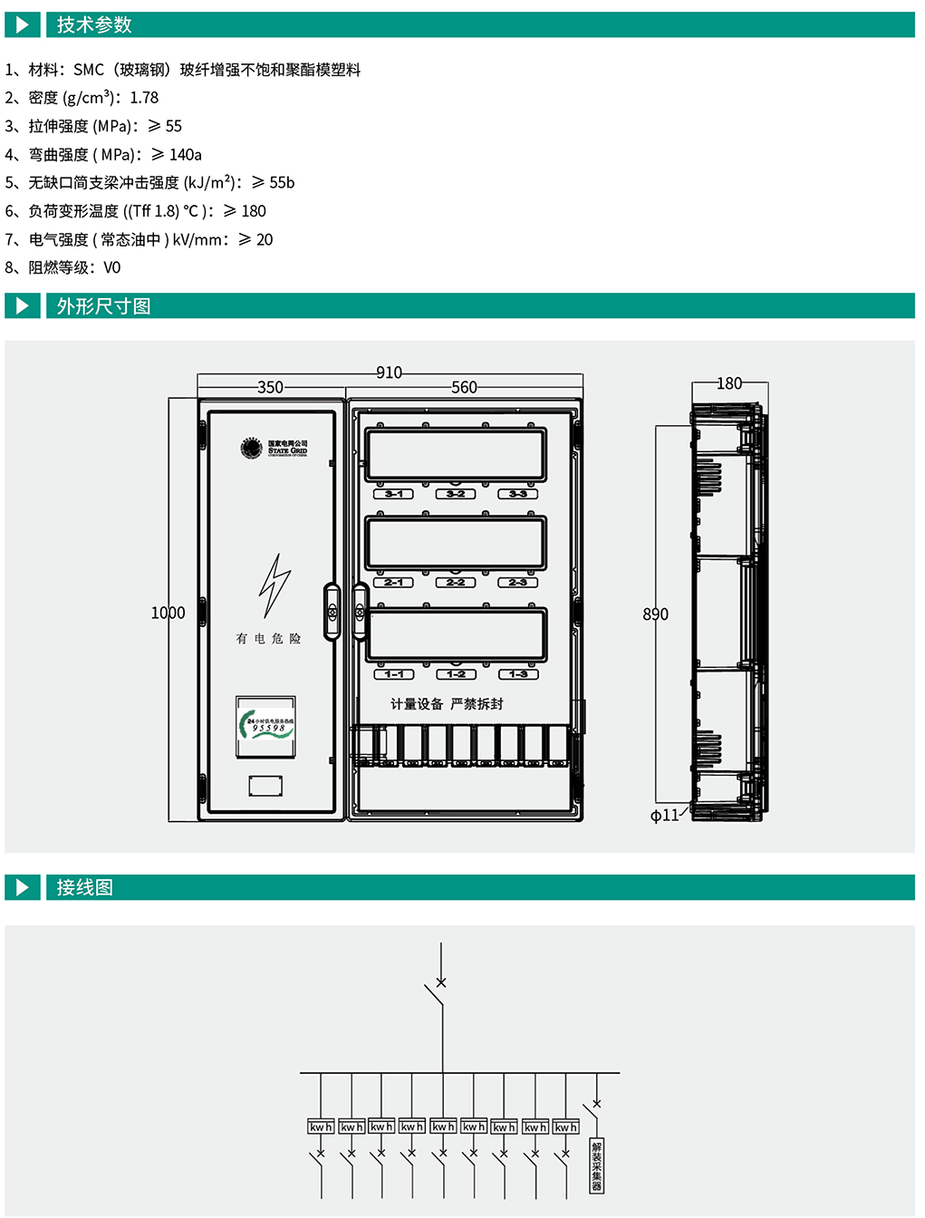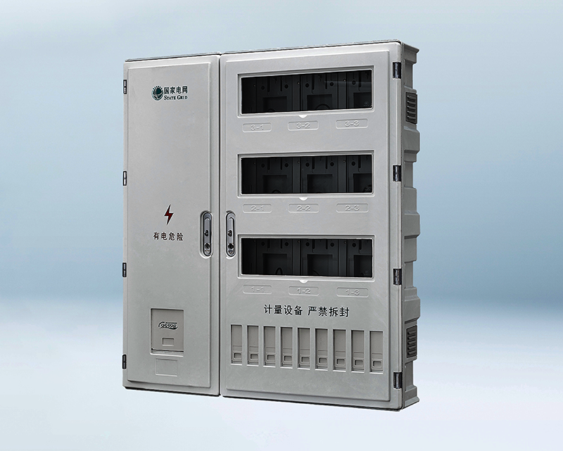 SX型低压非金属电能计量箱采用SMC玻璃钢增强型不饱和聚脂树脂模塑料,经过高温高压一次性成型,具有箱体坚固、、耐腐蚀、抗老化、长寿命、易于安装、操作简便等特点。其独特的性能,解决木制、钢制、塑料电表箱易老化、易腐蚀、绝缘差、耐寒性差、阻燃性差、寿命短的缺点,玻璃钢电能计量箱的优良性能,有绝对的密封防水性能、不需接地线,外表美观,有锁与铅封的安全保护,寿命室外可达40年以上,室内60年以上,强度为1N.m,是其它金属塑料电表箱无可比拟的。